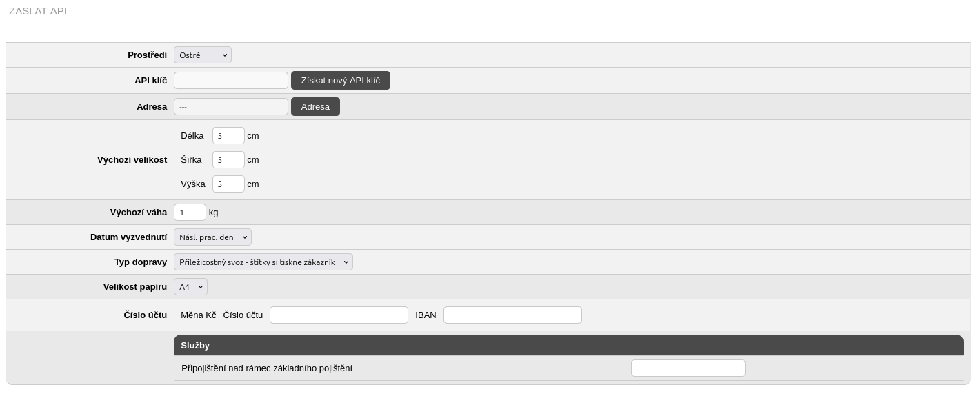 Po úspěšném získání API klíče vyplníme výchozí nastavení pro službu Zaslat.cz jako je výchozí váha (doplní se automaticky v případě, že není váha u objednávky vyplněna nebo není aktivní modul vah), výchozí velikost a další.