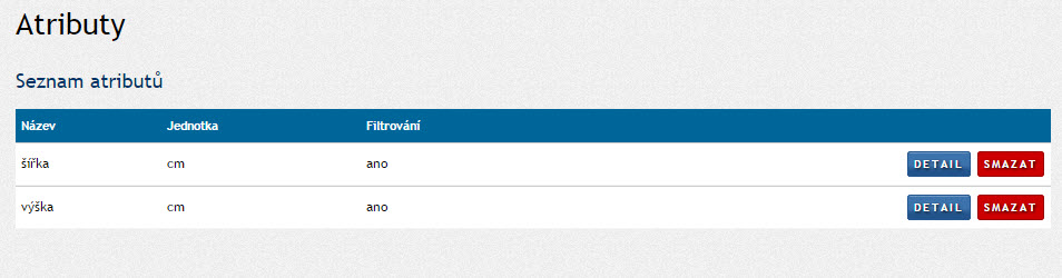 V této sekci se editují atributy (parametry), které je možné vkládat k produktům a kategoriím. Atributy jsou vlastnosti, které, kromě toho, že dávají zákazníkům doplňující informace, mohou sloužit pro filtrování produktů v kategoriích.