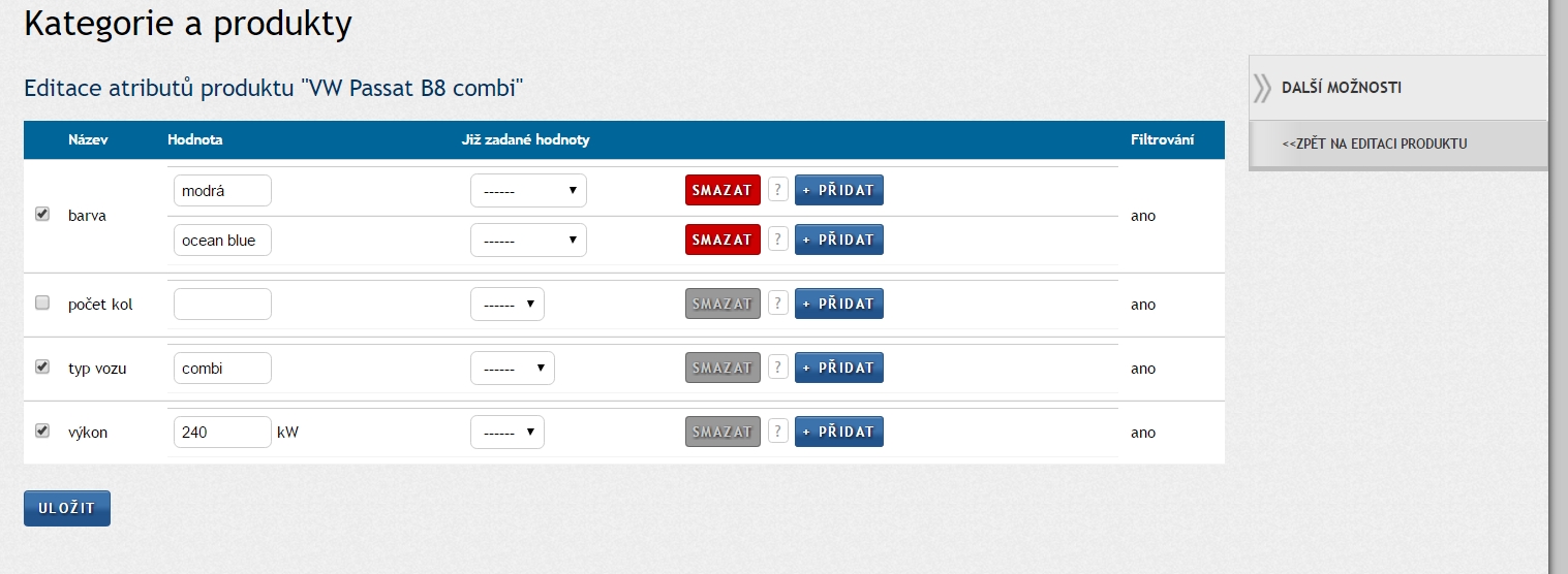 Jakmile jsou atributy v systému vytvořeny, můžete pro konkrétní produkt vybrat, které z atributů budou pro produkt platné a nastavit mu hodnotu - buď hodnotu, kterou má již některý z produktů, nebo zcela individuální hodnotu.