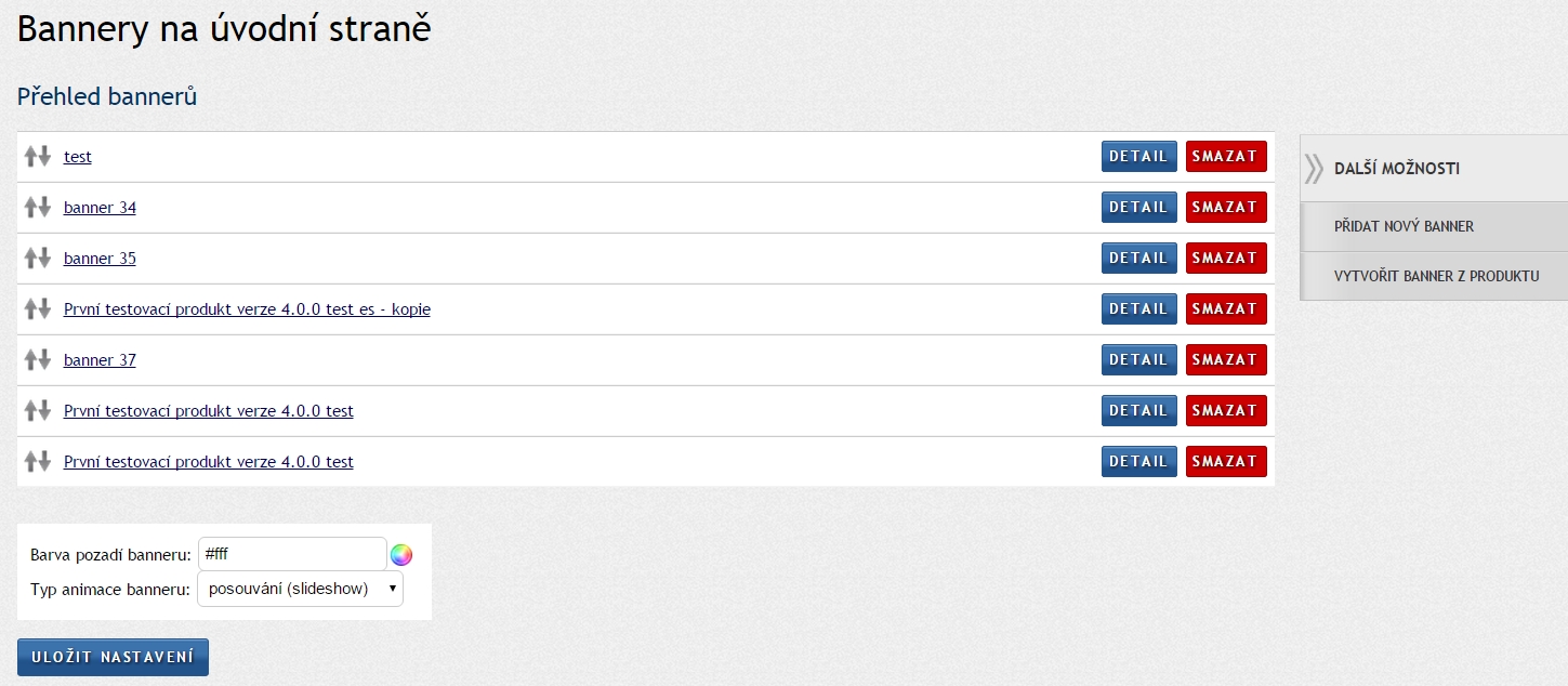 Přehled jednotlivých vytvořených bannerů se nachází na úvodní stránce editace dané sekce. Pořadí v rámci vytvořených bannerů můžete jednoduše změnit uchopením banneru v oblasti šipek a přesunutím na požadovanou pozici. Pod seznamem dostupných bannerů se nachází další možnosti nastavení: