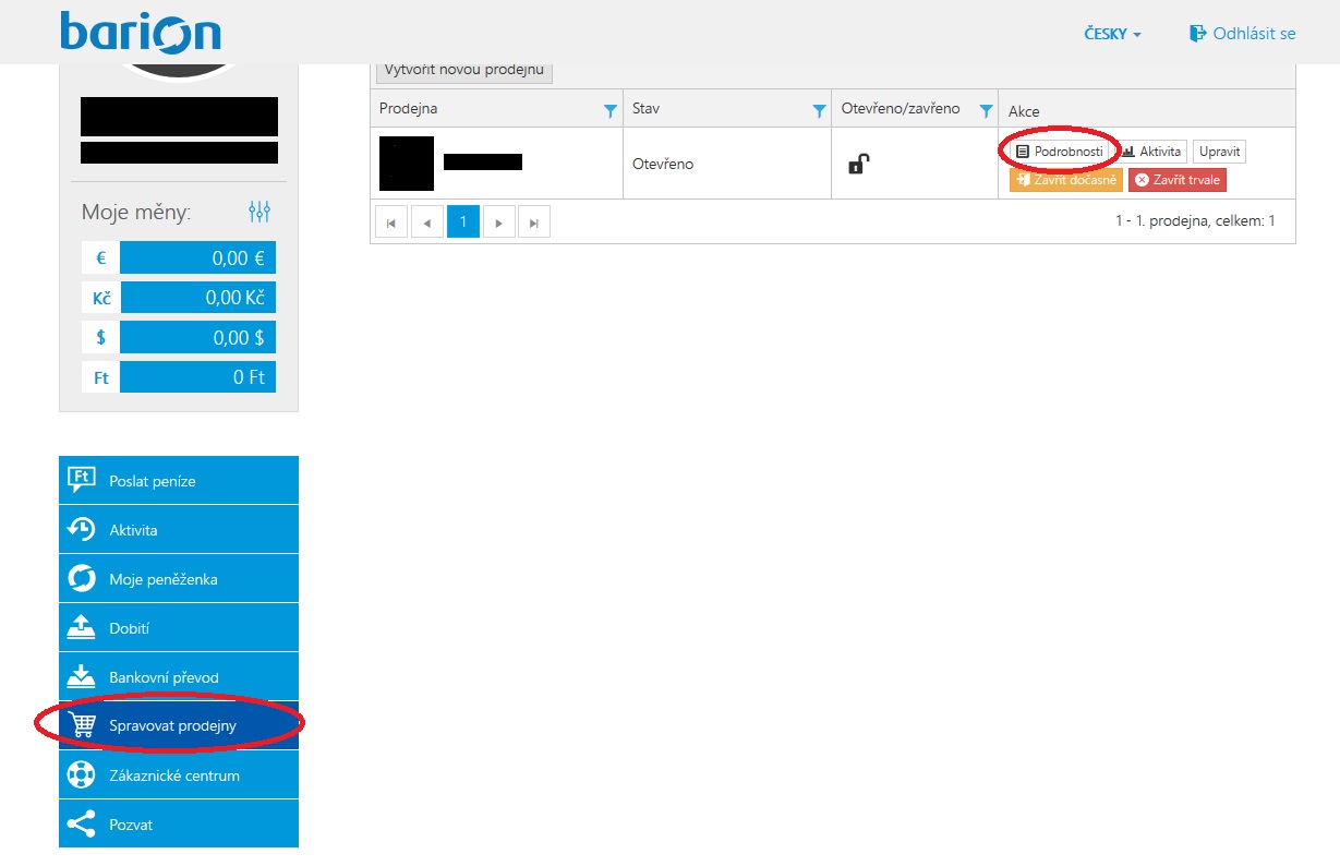 Přihlásíme se do administrace platební brány, kde z levého menu vybereme možnost "Spravovat prodejny" a u naší prodejny vybereme možnost "Podrobnosti".