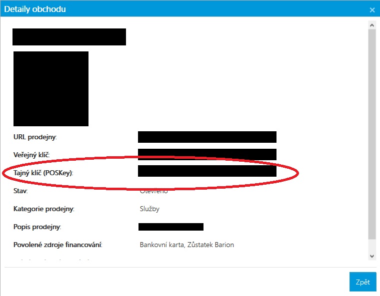 Následně se nám zobrazí vyskakovací okno, kde se nachází údaj "Tajný klíč (POSKey)" , který zkopírujeme a vložíme do administrace eshopu.