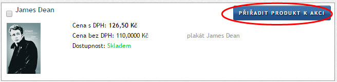 Pokud chcete zvolit jednotlivý produkt, na který se bude akce vztahovat stačí u jeho náhledu kliknout na tlačítko PŘIŘADIT PRODUKT K AKCI. Vybraný produkt se tak přesune do seznamu přiřazených produktů k akci. Z tohoto seznamu je možné jej odstranit pomocí tlačítka ODEBRAT. Pro rychlejší vkládání většího množství produktů do akce je možné využít i zaškrtávací pole označit vše, které naleznete nahoře nad seznamem produktů nebo produkty vybrat pomocí zatrhávacího pole a tlačítka PŘIŘADIT OZNAČENÉ PRODUKTY, které naleznete dole pod seznamem produktů.