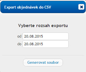 Umožňuje exportovat seznam objednávek do formátu CSV. Po kliknutí na export se objeví okno s dotazem na časový rozsah, který požadujete vyexportovat (viz obr.). Po zadání požadovaného rozsahu klikněte na tlačítko "Generovat soubor" a tím spustíte proces generování. Tento trvá pouze několik málo okamžiků a poté se objeví nabídka stažení souboru. Soubory CSV je souborový formát určený pro výměnu tabulkových dat a je jej tedy možné spustit i v tabulkových editorech typu Microsoft Excel. Díky jednoduchosti a čitelnosti se tento formát používá pro výměnu informací mezi různými systémy.