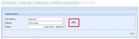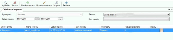 Nyní můžete provést nahrání CSV souboru a importovat zásilky. Vyberte právě vytvořenou šablonu a klikněte na tlačítko Import. Zvolte CSV soubor a počkejte na dokončení importu. Pro zobrazení právě importovaného souboru je nutné kliknout na tlačítko Vyhledat.
