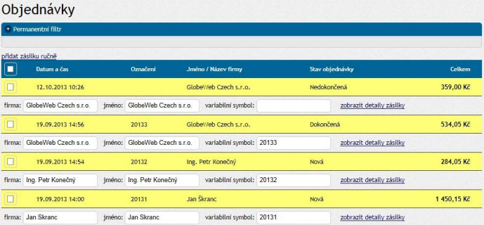 Pro snazší orientaci v objednávkách naleznete nahoře nad seznamem odkaz na permanentní filtr, který umožňuje upřesnit, které objednávky se mají v seznamu zobrazovat. Máte tak možnost určit, že se nemají zobrazovat objednávky s jiným způsobem dopravy nebo objednávky, které jsou již vyřízené.