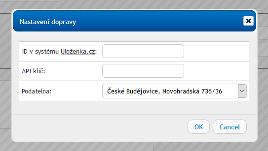 Pro připojení k API je nutné vyplnit nastavení. Nastavení k dopravám se nachází v sekci Nastavení > Dopravy > výběr požadované dopravy, zde v sekci "Doprava má speciální možnosti" zvolte Uloženka nové API. Následně se umožní vyplnit nastavení pro připojení k API a poté vybrat pobočky, které mají být k této dopravě přiřazeny. Pobočky je možné přiřadit k více dopravám, aby mohla být nastavena různá cena např. dle státu nebo využívané služby.