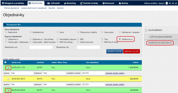 Jakmile budete mít vybrané požadované objednávky klikněte v pravém menu na tlačítko dle Vašeho výběru. API odešle informace přímo do systému zasilkovna.cz.