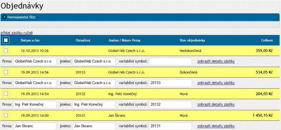 Nahoře nad seznamem objednávek naleznete odkaz na permanentní filtr, který umožňuje upřesnit, které objednávky se mají v seznamu zobrazovat. Máte tak možnost určit, že se nemají zobrazovat objednávky s jiným způsobem dopravy nebo objednávky, které jsou již vyřízené.