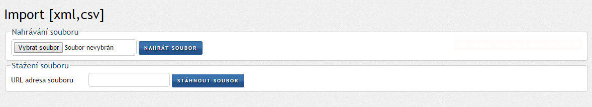 Jako první krok při zobrazení rozhraní importů je potřeba vložit soubor, který chcete importovat. Podporované koncovky souborů jsou xml a csv. Jakmile budete mít soubor vybraný, tak pokračujte stisknutím tlačítka NAHRÁT SOUBOR. Případně lze soubor vložit i pomocí URL adresy.