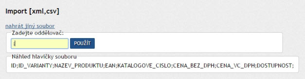První řádek CSV souboru musí obsahovat názvy sloupců, aby bylo možné následně zařadit příslušné sloupce jednotlivým položkám produktu. Jako první je potřeba vybrat oddělovač hodnot v tomto souboru (většinou je to středník). Pokud nevíte, jaký oddělovač je v CSV souboru používán, zkuste se podívat na první řádek CSV souboru, ze kterého by měl být oddělovač patrný. Po zadání oddělovače a stisknutí „použít“, se dostanete na další krok importu.