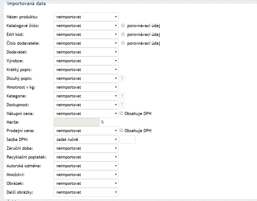 Pokud si nejste zcela jisti tím, co který sloupec CSV dokumentu obsahuje, obraťte se na dodavatele tohoto CSV souboru s prosbou o zaslání bližšího popisu. Není nutné, abyste měli ke každé položce přiřazen nějaký sloupec CSV dokumentu - ty položky, které budou prázdné, se nebudou do e-shopu importovat.