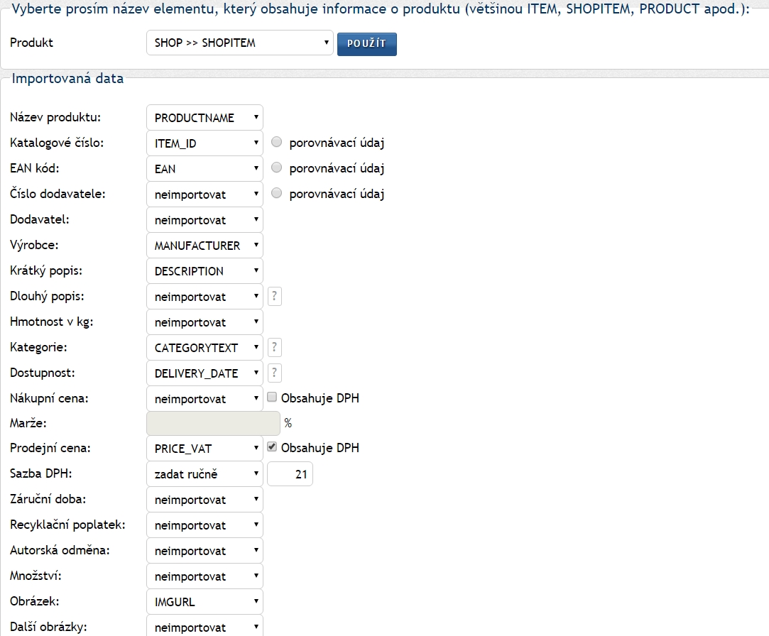 Elementy XML dokumentu jsou většinou pojmenovány anglicky a jde z nich překladem odvodit, jaké hodnoty obsahují (např. PRODUCT_NAME - název produktu, DESCRIPTION - popis, IMGURL - adresu obrázku apod.). Pokud si nejste zcela jisti tím, co která položka XML dokumentu obsahuje, obraťte se na dodavatele tohoto XML souboru s prosbou o zaslání bližšího popisu. Není nutné, abyste měli ke každé položce přiřazen nějaký atribut XML dokumentu - ty položky, které budou prázdné, se nebudou do e-shopu importovat.