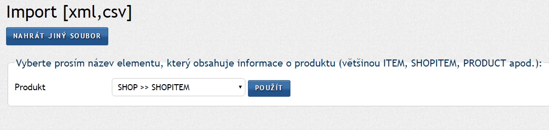 Při importu z individuálního XML souboru, např. od dodavatele, je potřeba nejprve vybrat "základní větev" XML pro import Produktů a pak stisknout „použít“. Název základní větve je většinou pojmenován ITEM, SHOPITEM, PRODUCT a podobně.