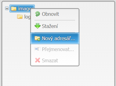 Při nahrávání obrázku můžete zvolit také složku na serveru, do které má být orázek nahrán (tyto složky a podsložky můžete libovolně vytvářet). Tuto možnost zvažte, pokud budete nahrávat více obrázků a budete chtít mít obrázky roztříděny podle nějaké logiky. Složky se vybírají v levém panelu. Pokud žádnou složku nevyberete vloží se obrázek do výchozí složky.