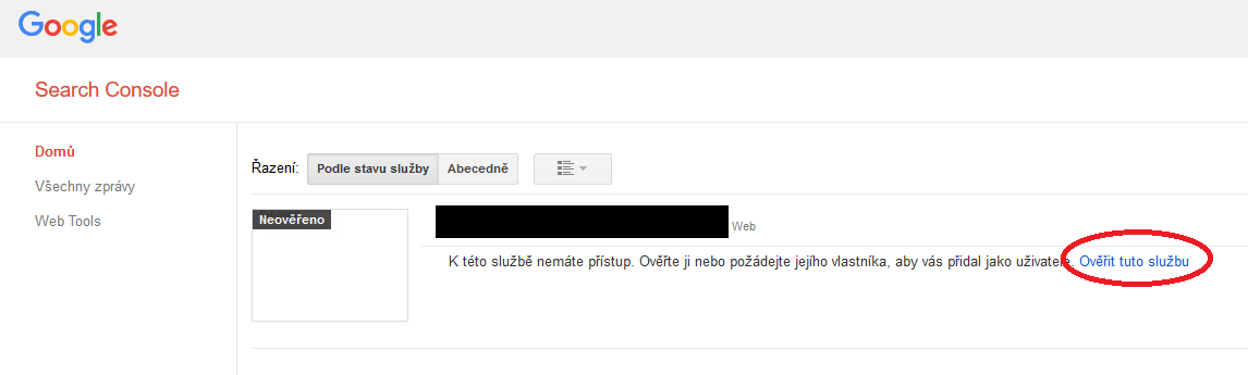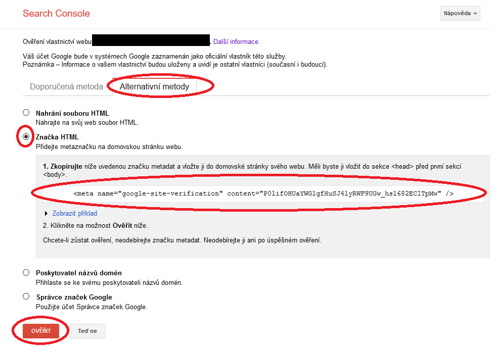 V případě potřeby ověření vlastnictví stránek postupujte následovně: