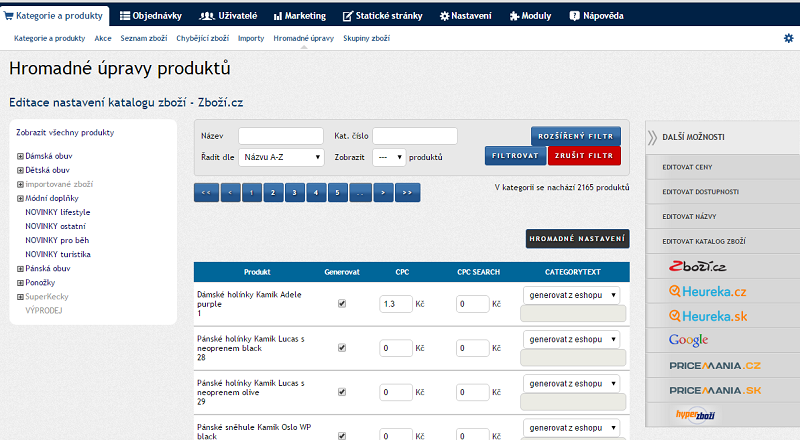 Kategorie a produkty / Hromadné úpravy produktů (vpravo dole) / Editovat katalog zboží / Zboží.cz