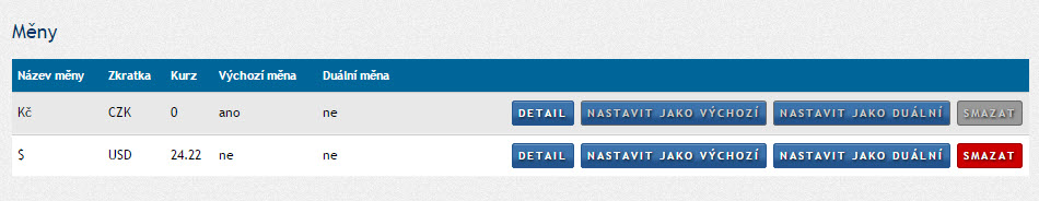 Jakmile budete mít zadány všechny používané měny vyberte, která z nich má být výchozí (kliknutím na tlačítko výchozí měna v příslušném řádku) případně máte možnost nastavit některou z měn jako duální (zobrazuje se společně s výchozí měnou a jsou viditelné obě částky).