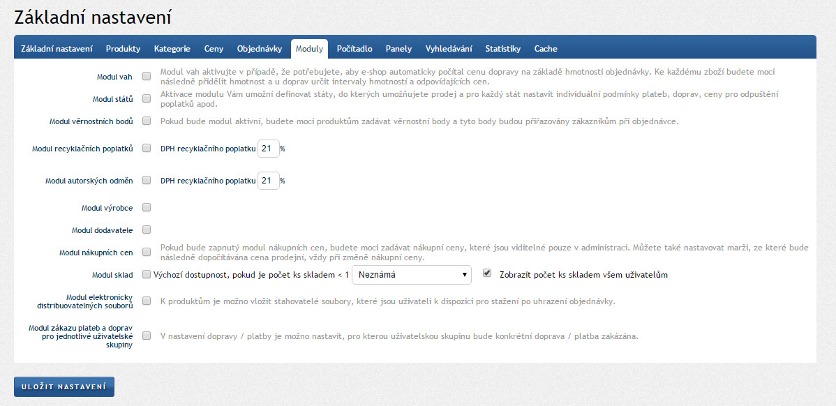 Pokud je zapnutý umožní nastavit v NASTAVENÍ - STÁTY země, do kterých je možné zasílat zboží. Na tyto státy je pak možné navázat ruzné druhy dopravy za různou cenu, různé možnosti plateb nebo třeba minimální výši objednávky pro odpuštění dopravních poplatků
