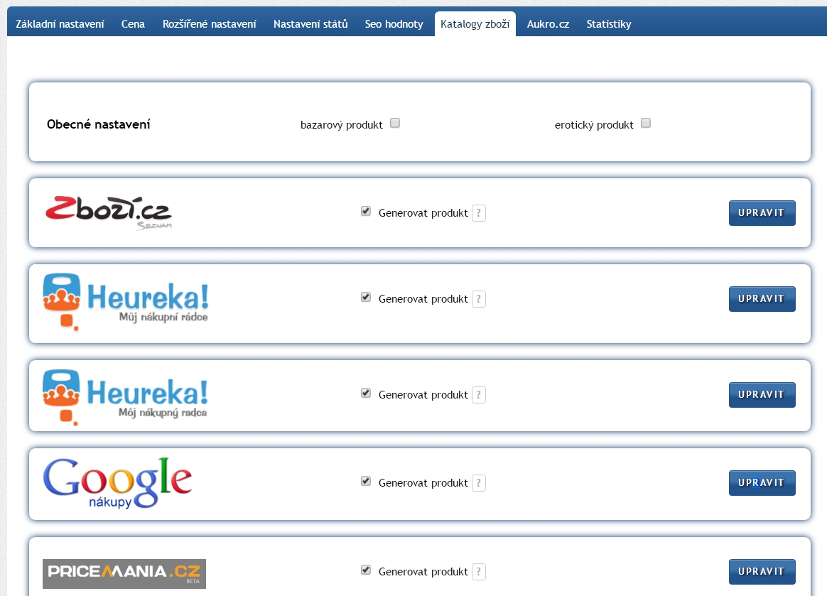 Tato záložka umožňuje určit do kterých katalogů zboží chcete produkt exportovat a dává možnost editovat odesílané informace na tyto vyhledávače. Pro generování stačí zatrhnout GENEROVAT PRODUKT a není nutné zasahovat do dalšího nastavení. V případě, že však chcete dosáhnout lepšího spárování produktu na katalogu, máte možnost ovlivnit odesílané informace přes tlačítko EDITOVAT. Detailní popis toho, co by mělo být vyplněno v jednotlivých volbách katalogu naleznete v nápovědě příslušného katalogu.