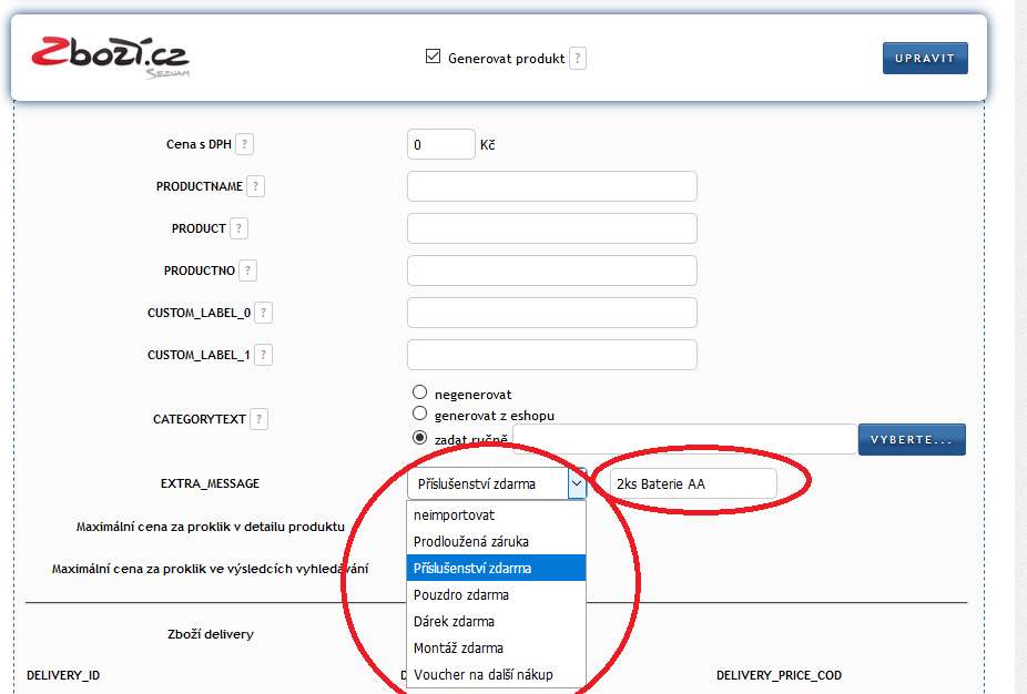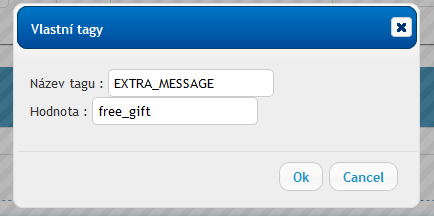 Následne vložíme do pole “Název tagu” hodnotu “EXTRA_MESSAGE” a do pole “Hodnota” vložíme hodnotu podle dokumentace zboží.cz (https://napoveda.seznam.cz/cz/zbozi/specifikace-xml-pro-obchody/specifikace-xml-feedu/#EXTRA_MESSAGE) v tomto případě “free_gift” - dárek zdarma.