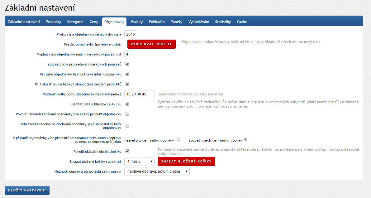 Zde je možné nastavit základní vlastnosti týkající se objednávek, způsobu jejich číslování a orientace v nich. Prefix čísla objednávek je počáteční číslo sloužící například pro identifikaci e-shopu nebo roku. Údaj o celkovém počtu míst slouží k tomu, aby bylo možné nastavit jak dlouhé má celé číslo objednávky být.