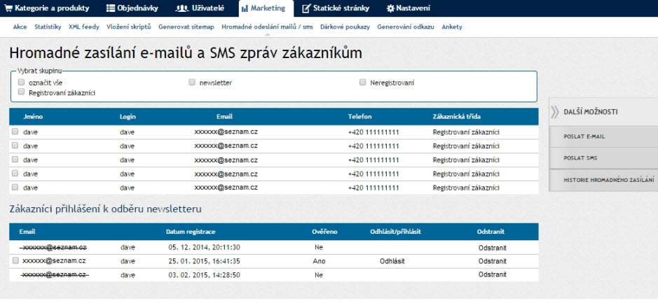 Tato funkce slouží pro marketingové oslovení registrovaných zákazníků pomocí e-mailové zprávy nebo pomocí SMS zprávy zaslané na jejich mobilní telefon. Ve chvilce jste tak schopni dát zákazníkům vědět o právě naskladněném zboží, slevě nebo novince v e-shopu.