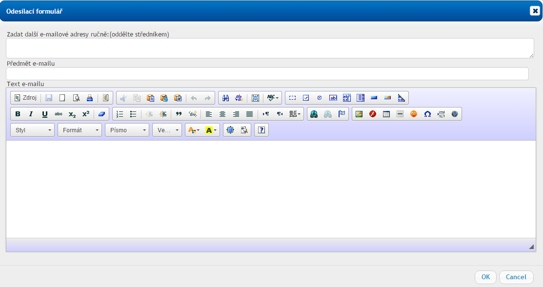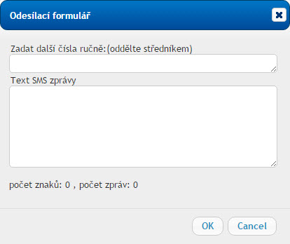 Do formuláře zadáte konkrétní text SMS zprávy nebo e-mailu a stisknete tlačítko OK. Pokud jste vybrali více příjemců může odesílání trvat delší dobu.