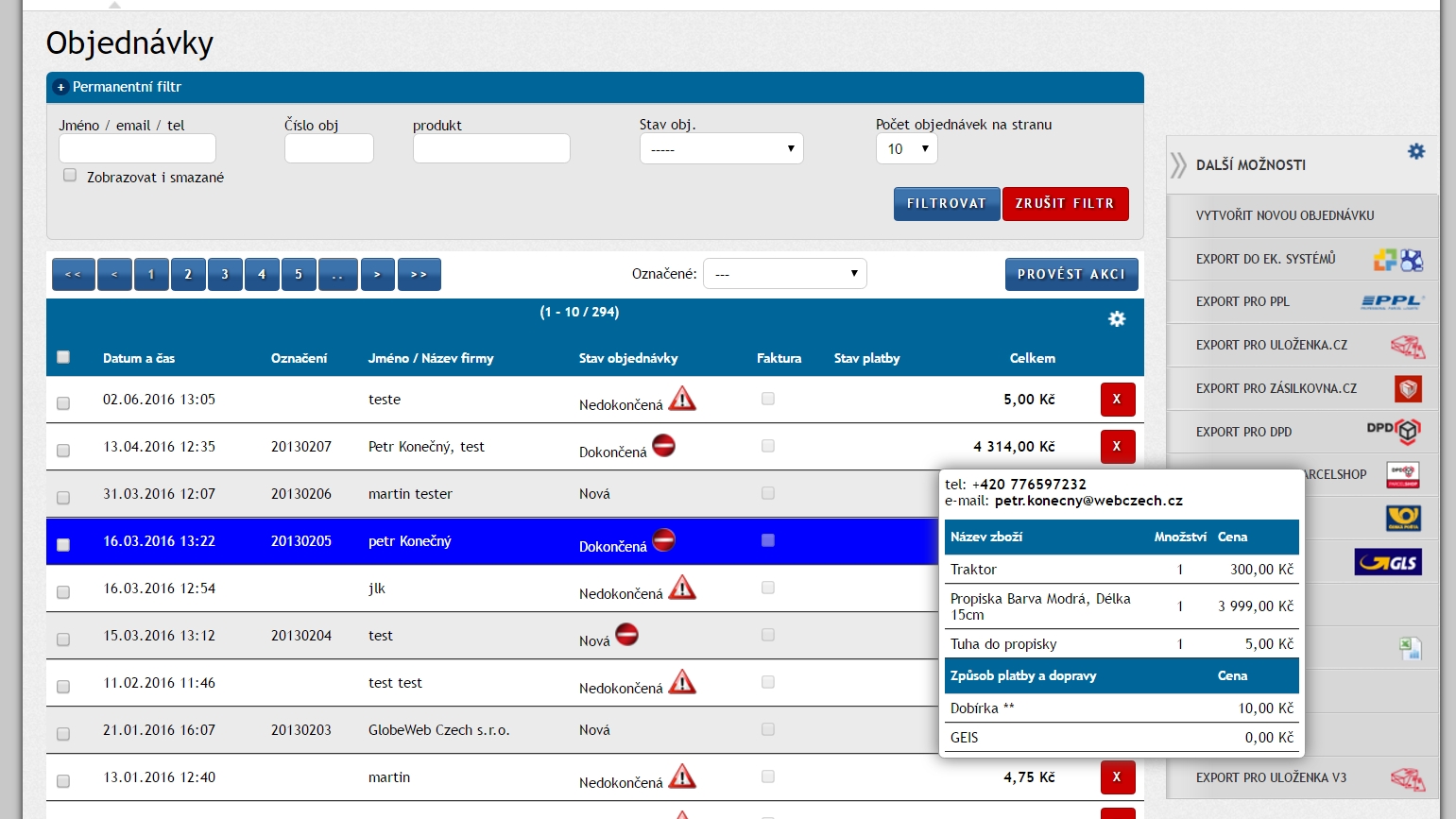 Skrze rychlou volbu je možné vybraným objendávkám měnit stav, mazat je, tisknout, generovat faktury (pokud máte tento modul povolen), případně provádět exporty do CSV / XML pro ek. systémy / přepravce.