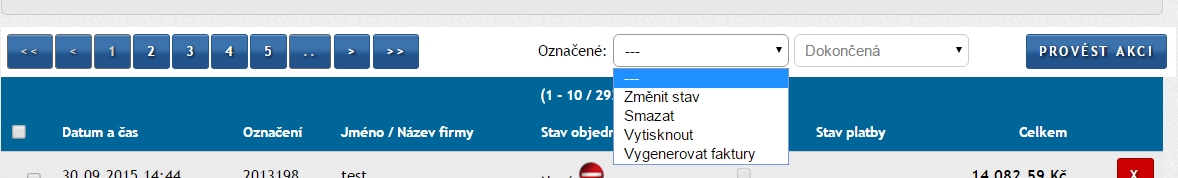 Nad seznamem objednávek se nachází menu hromadné akce, které umožňuje zvoleným objednávkám (srkze zaškrtávací políčko) provést hromadnou akci (tisk, smazání, změna stavu, export pro ek. systémy apod.).