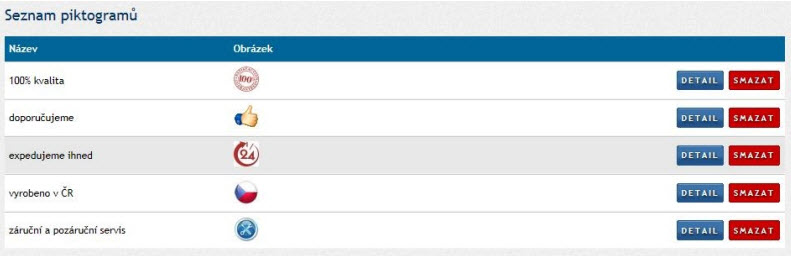 V této sekci je možné přidávat a odebírat tzv. piktogramy. Piktogramy jsou grafické ikony, které se mohou používat pro zvýraznění produktu, který je například v akci, ve slevě apod. Připravený piktogram musí být ve formátu JPG, GIF nebo PNG a neměl by překračovat rozměry 32 x 32 pixelů. Ke každému piktogramu můžeme doplnit název a přidání ke konkrétnímu produktu se provádí přes editace produktu - piktogramy. Přidání piktogramu do e-shopu provedeme stisknutím tlačítka VLOŽIT NOVÝ PIKTOGRAM, zadáním názvu a zvolením souboru s piktogramem.