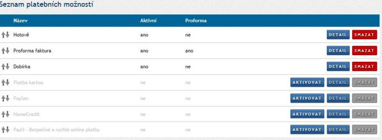Pořadí plateb v administraci a v rozhranní pro zákazníka lze jednoduše ovlivnit chycením za šipky před názvem platby a přetažením na potřebnou pozici.