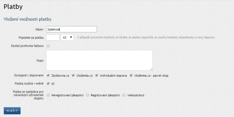 Přidání způsobu platby se provede tak, že se v pravém menu klikne na volbu VLOŽIT NOVOU PLATBU. Následně se vyplní název způsobu platby, částka poplatku v Kč a možnost zatrhnout, zda se má automaticky generovat zálohová faktura. Generování zálohové (proforma) faktury se využívá hlavně pro platbu předem nebo při osobním odběru zboží. Zákazník tak ihned po provedení objednávky dostává na e-mail informace s číslem účtu, variabilním symbolem platby a částkou, kterou má uhradit. Variabilní symbol je číslo objednávky. Důležité je provázat danou platbu s dopravou, se kterou je možné ji kombinovat. V opačném případě se ve výběru platby a dopravy daná možnost nezobrazí.