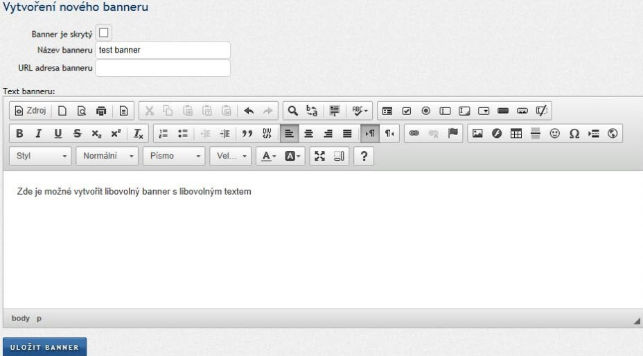 Kliknutím na tlačítko VYTVOŘIT NOVÝ BANNER v pravém menu máte možnost vytvořit libovolný banner, který bude následně zařazen mezi rotující. První volbou máte možnost nastavit, zda bude banner viditelný nebo skrytý. Toto se dá využít například při přípravě reklamní kampaně, kdy nechcete, aby banner byl hned viditelný. Dále zadáte název banneru, pro Vaši snazší orientaci v přehledu bannerů. Pokud chcete, máte možnost i editovat URL adresu banneru - jedná se o URL adresu, na kterou bude zákazník přesměrován po kliknutí na banner. Dále je zde k dispozici editor, prostř. kterého můžete banner dle Vašich představ vytvořit a editovat. Vytvořený banner uložíte do systému tlačítkem ULOŽIT BANNER.
