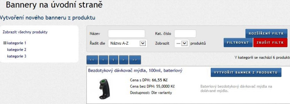 Volbu automatického vytvoření banneru z produktu vyvoláte kliknutím na tlačítko VYTVOŘIT BANNER Z PRODUKTU, které naleznete v pravém menu v přehledu bannerů. U vybraného produktu následně kliknete na tlačítko VYTVOŘIT BANNER Z PRODUKTU