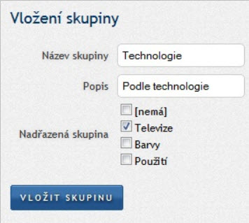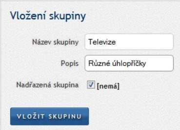 Nová skupina se vytváří kliknutím na tlačítko Vytvořit novou skupinu. U skupin je evidován název skupiny, popis (určený pouze pro interní použití) a nadřazená skupina. Při vytváření skupin je doporučeno postupovat od nejvyšší (nejobecnější) úrovně po nejnižší (nejkonkrétnější). Hlavní (nejvyšší) skupina musí mít jako nadřazenou skupinu možnost [nemá] – bude zobrazena jako první skupina z celého stromu podskupin.