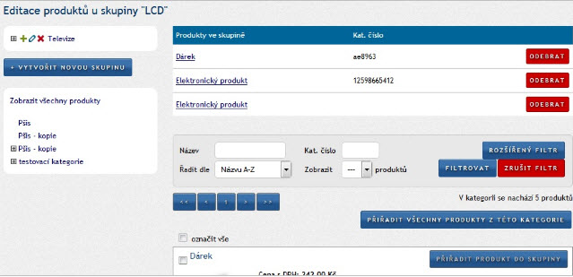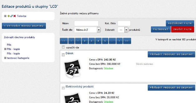 V levém sloupci se stromovou strukturou skupin a podskupin se zvolí skupina kliknutím na její název, ke které se mají produkty přiřadit. Produkt do skupiny se přiřazuje kliknutím na tlačítko Přiřadit produkt do skupiny, pro usnadnění přiřazování produktů je možné produkty zobrazit podle kategorií nebo celou kategorii rovnou přidat do skupiny.