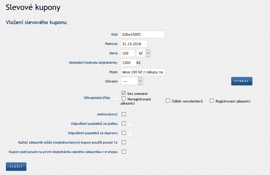 - Užívatelská třída - kupón je možné nastavit, aby byl platný jen pro konkrétní užívatelskou třídu.