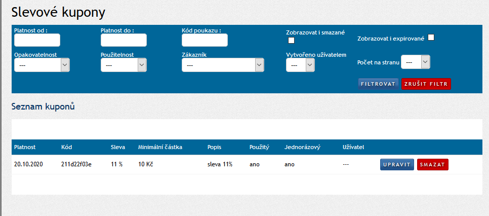 Tato funkce slouží pro zadávání a editaci slevových kupónů. Po kliknutí na tuto volbu se zobrazí přehled všech dostupných kupónů. Nachádzí se tu také filtr, kde si můžeme kupóny vyfiltrovat podle zvolených kritérií.