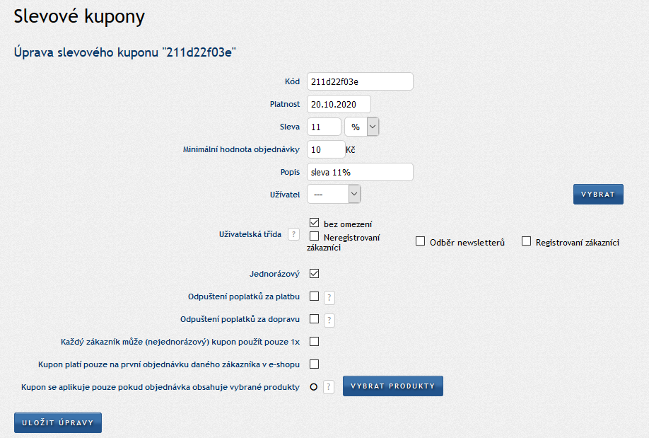 Vygenerované slevové kupóny je možné editovat kliknutím na tlačítko UPRAVIT.