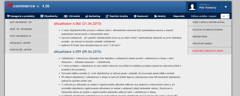 V pravé části se nachází odkaz pro zobrazení verze Vašeho shopu a historie změn, odkaz na diskuzní fórum, odkaz na hlasování o úpravách e-shopu. Nejdůležitějším odkazem v pravé sekci je Dotaz na technickou podporu, prostřednictvím kterého je třeba zasílat Vaše dotazy nebo popis problémů.