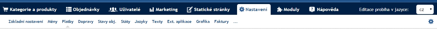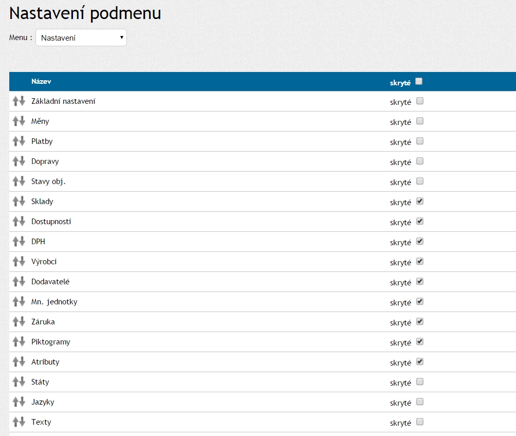 V pravé části každého submenu se nachází ikonka ozubeného kola, prostř. které je možné nastavit, které položky se v rámci daného menu mají vypisovat a je také možné nastavit jejich pořadí. Ne vždy potřebuje správce e-shopu, aby byly všechny položky viditelné a pokud jejich zobrazování nastaví dle svých potřeb, může tak velmi zefektivnit práci v systému. Pokud jsou některé položky v menu skryté je možné je zobrazit kliknutím na "..." - viz obrázek výše.