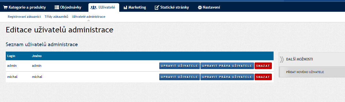 Uživatelé administrace jsou uživatelské přístupy sloužící přímo k přístupu do administrace e-shopu. Přidání nového uživatele do administrace e-shopu se provádí stejně jako klasického uživatele/zákazníka v pravém menu (položka PŘIDAT NOVÉHO UŽIVATELE) v přehledu všech uživatelů, na který se dostanete kliknutím na položku UŽIVATELÉ – UŽIVATELÉ ADMINISTRACE.