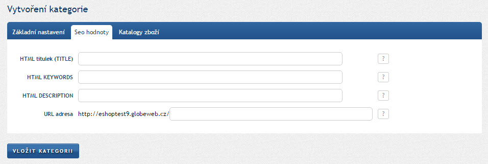 Jedná se o informace, které jsou pro běžného uživatele neviditelné (s výjimkou titulku, který se zobrazuje jako název okna / záložky v prohlížeči), ale o to důležitější jsou pro fulltextové vyhledávače. Titulek by měl obsahovat stručnou a výstižnou informaci o tom, co se v kategorii nachází (včetně např. pojmenování kategorie), popisek (description) potom o něco širší popis kategorie a klíčová slova (keywords) by měla obsahovat nejdůležitější slova / slovní spojení, která se budou vyskytovat v popisku / obsahu kategorie. Všechny tyto údaje jsou nepovinné a pokud je nezadáte, budou se generovat automaticky.
