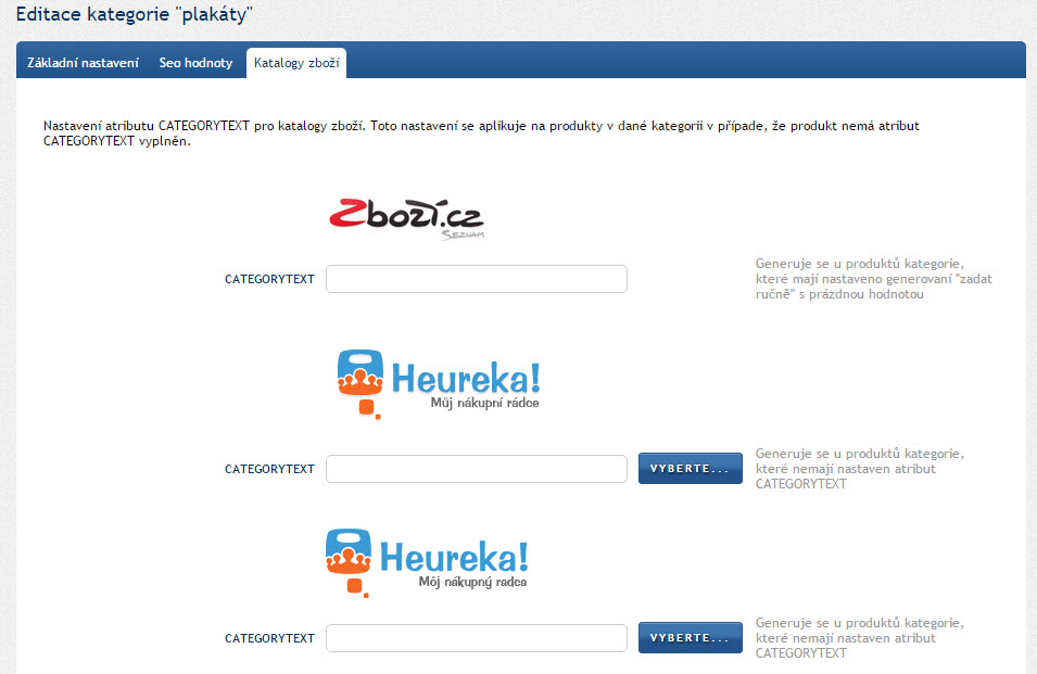 Při vytvoření či editaci kategorie můžete nastavit tzv. Category text. Tato funkce slouží pro přesné spárování produktů danné kategorie s kategoriemi, které jsou vytvořeny ve srovnávacích katalozích zboží. (pozn. CATEGORYTEXT lze hromadně editovat také v menu Hromadné úpravy kategorie - katalogy zboží.)