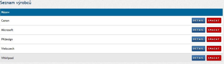 V této položce je možné centrálně pro celý e-shop nastavit výrobce jednotlivých produktů. Výrobci jsou defaultně seřazení podle abecedy. Tito výrobci se zobrazují zákazníkům a slouží pro snazší orientaci v produktech, který e-shop nabízí. Zákazník má možnost ve frontendu podle výrobců zboží filtrovat nebo jít ve výběru místo klasických kategorií právě podle výrobců.