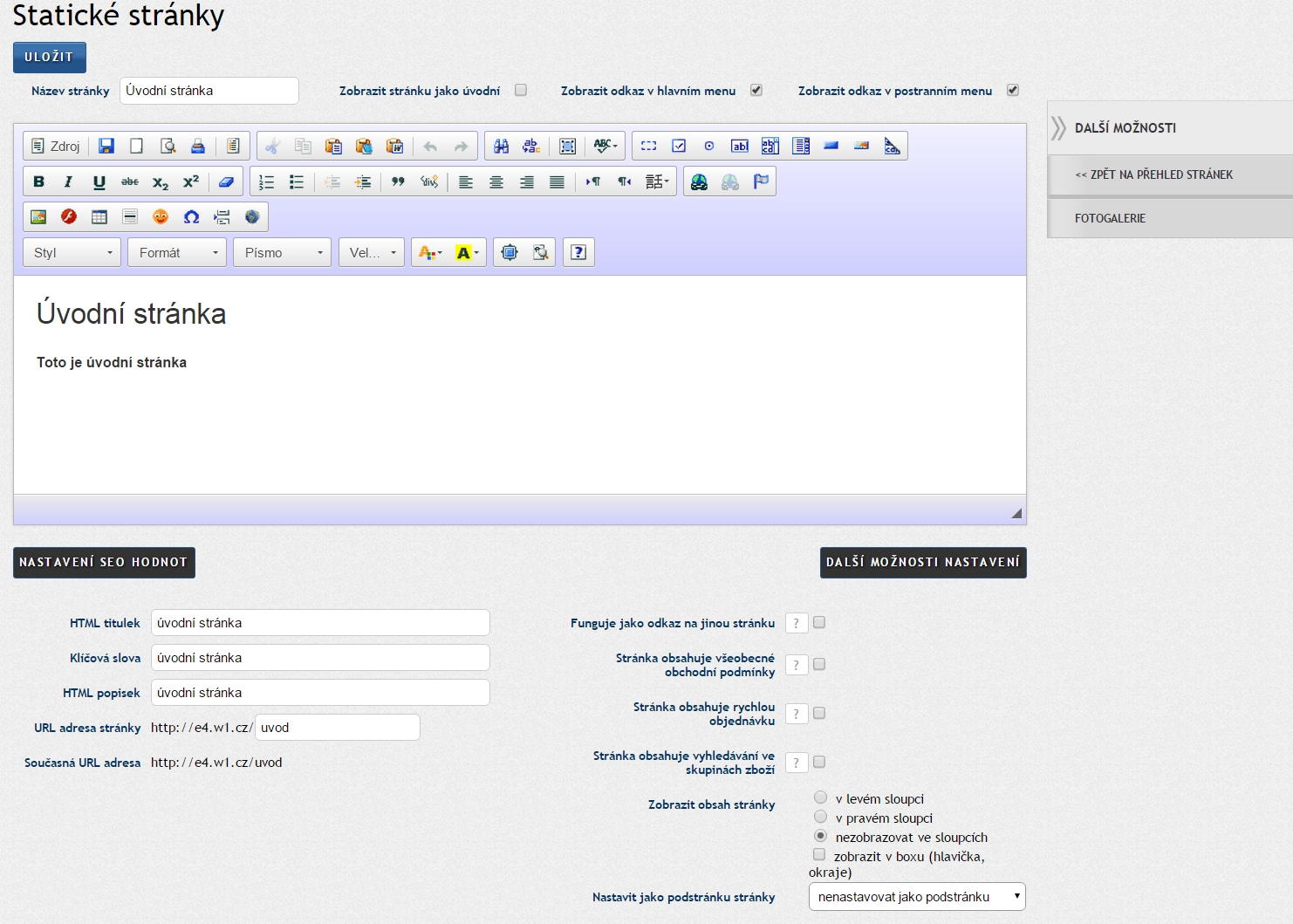 Kromě editoru, do kterého vkládáte obsah jsou v editaci statické stránky k dispozici také další možnosti nastavení: