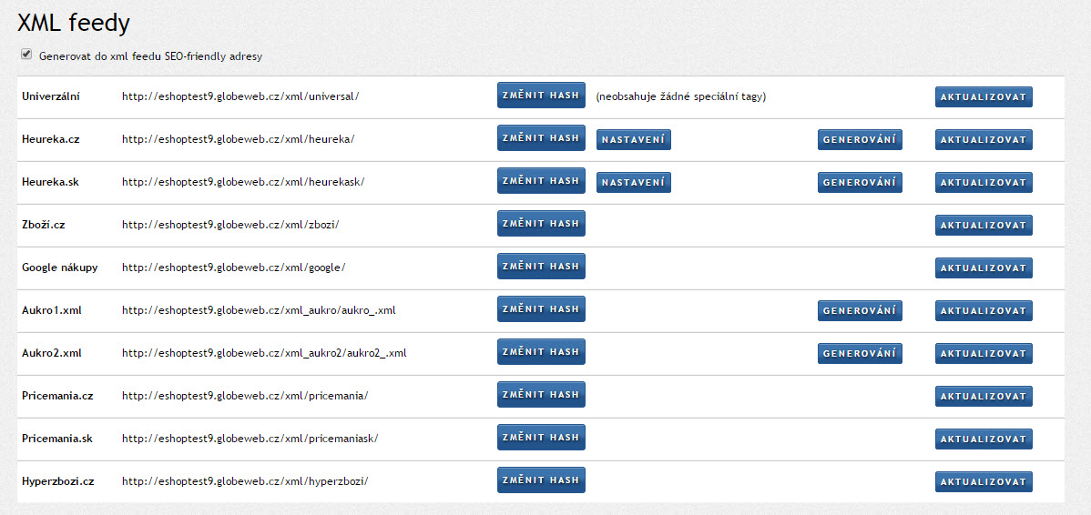 XML feedy jsou datové soubory, které obsahují podrobné informace o nabízených produktech. Prostřednictvím těchto souborů lze exportovat produkty (včetně ceny, popisu, dostupnosti a dalších informací) na vyhledávače zboží jako jsou např. zbozi.cz, www.heureka.cz, Google nákupy a další. Každý z těchto katalogů zboží má na podobu XML feedu odlišné požadavky a pro nejdůležitější katalogy jsme tedy vytvořili specializované generátory XML feedů. Adresy XML feedu se nachází vedle názvu daného XML feedu (viz obr. níže).
