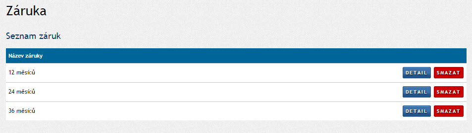 Přidání záruky je možné kliknutímna tlačítko VLOŽIT NOVOU ZÁRUKU v pravém menu a vyplněním názvu záruky, který se má u zboží zobrazovat. Editace názvu záruka je možná přes tlačítko DETAIL.