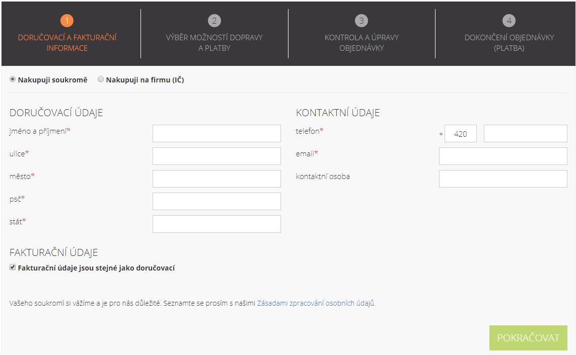 V tomto případě se budě věta o ochraně osobních údajů s odkazem na stránku obsahující detailní informace zobrazovat v košíku a 1 a 4. kroku objednávky. V objednávce to vypadá následovně: